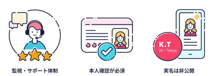 完全にゼロとは言い切れませんが、本人確認・通報・監視の三点でリスクを下げています。少しでも違和感があれば会わない・通報するが鉄則です。